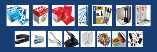 Board & Easel, Writing Instruments, Paper, File Organization, Desk Accessories, Puncher, Notebook, Clip Boards & Copy Holders, Clips, Rubber Band, Rulers, Calculators, Magnifying Glass, Glues, Spray, Adhesive Tape, Scissors, Cutting Tools, Blade, Tapes, Tape Dispenser, Stamp Supplies, etc.